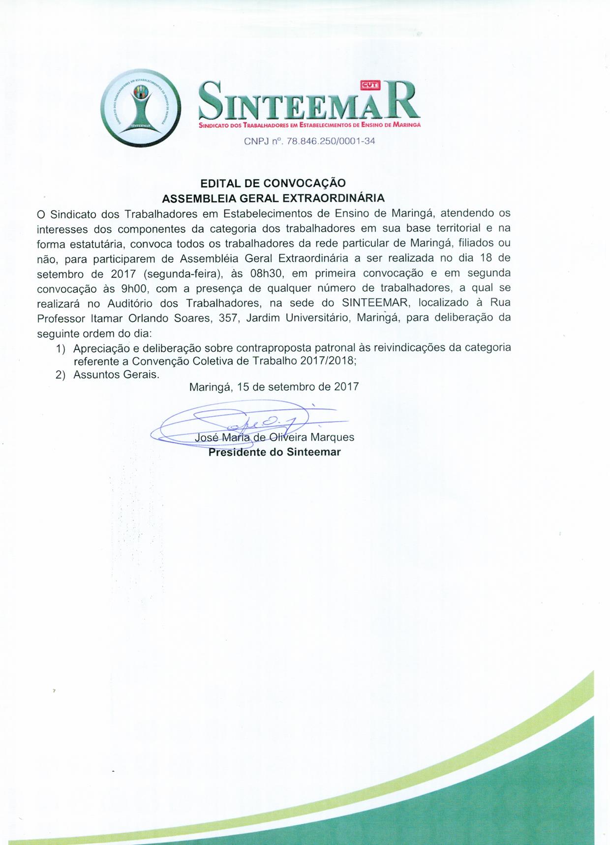 Sinteemar convoca assembleia para esta sexta-feira