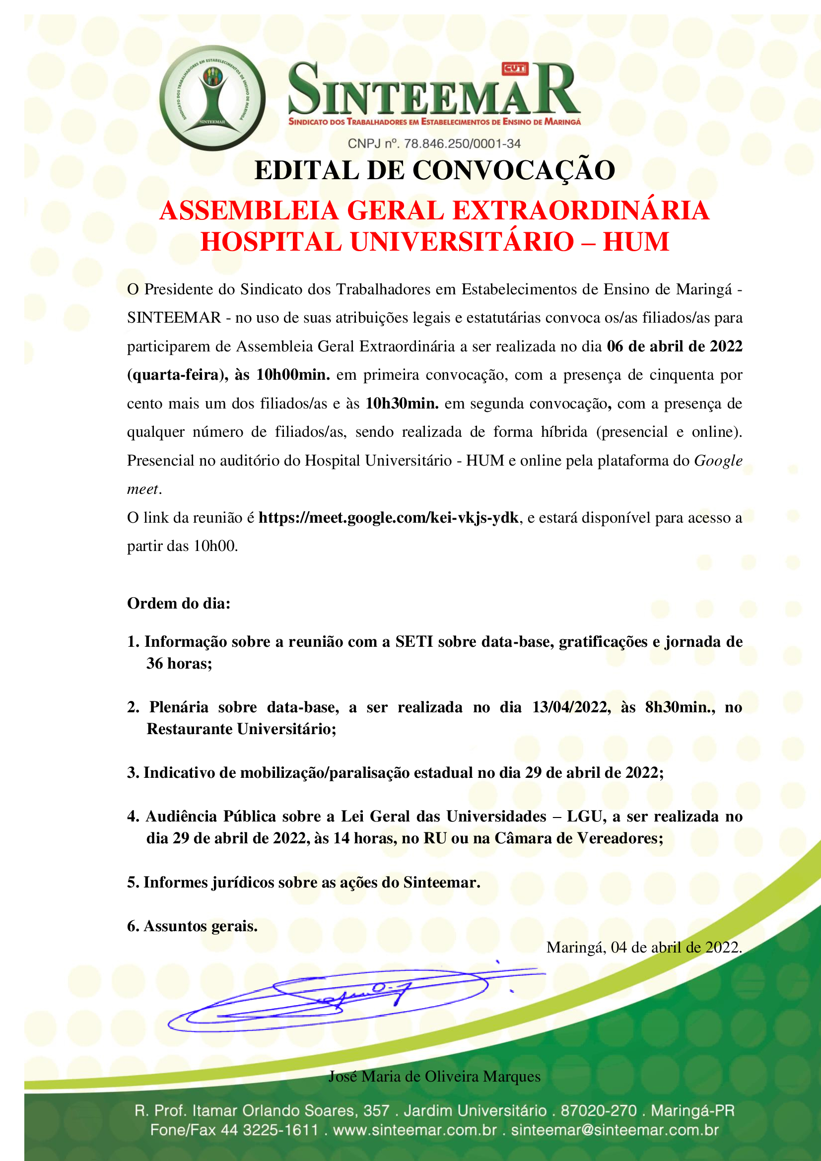 Sinteemar realiza assembleia híbrida (HUM) nesta quarta-feira, 6 de abril